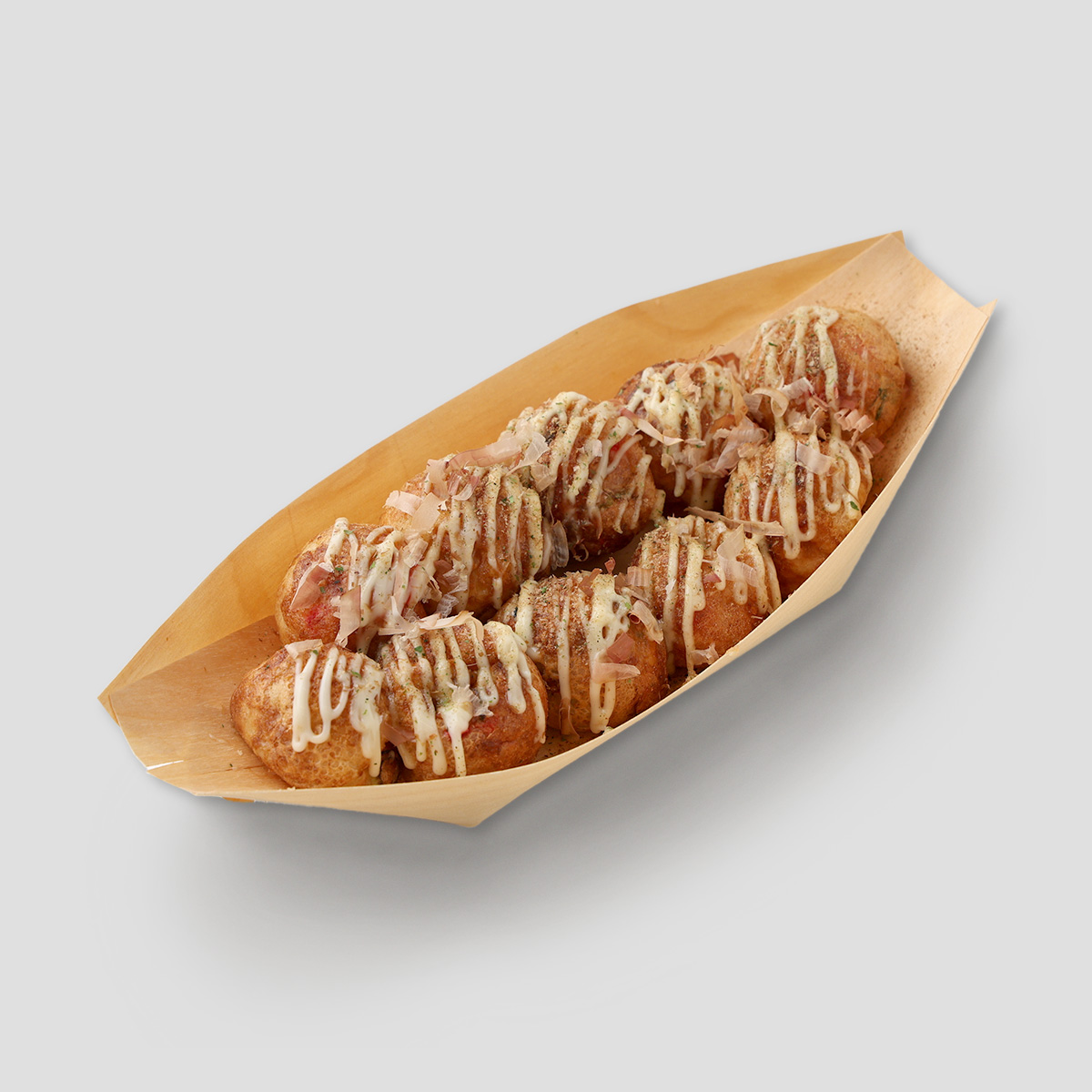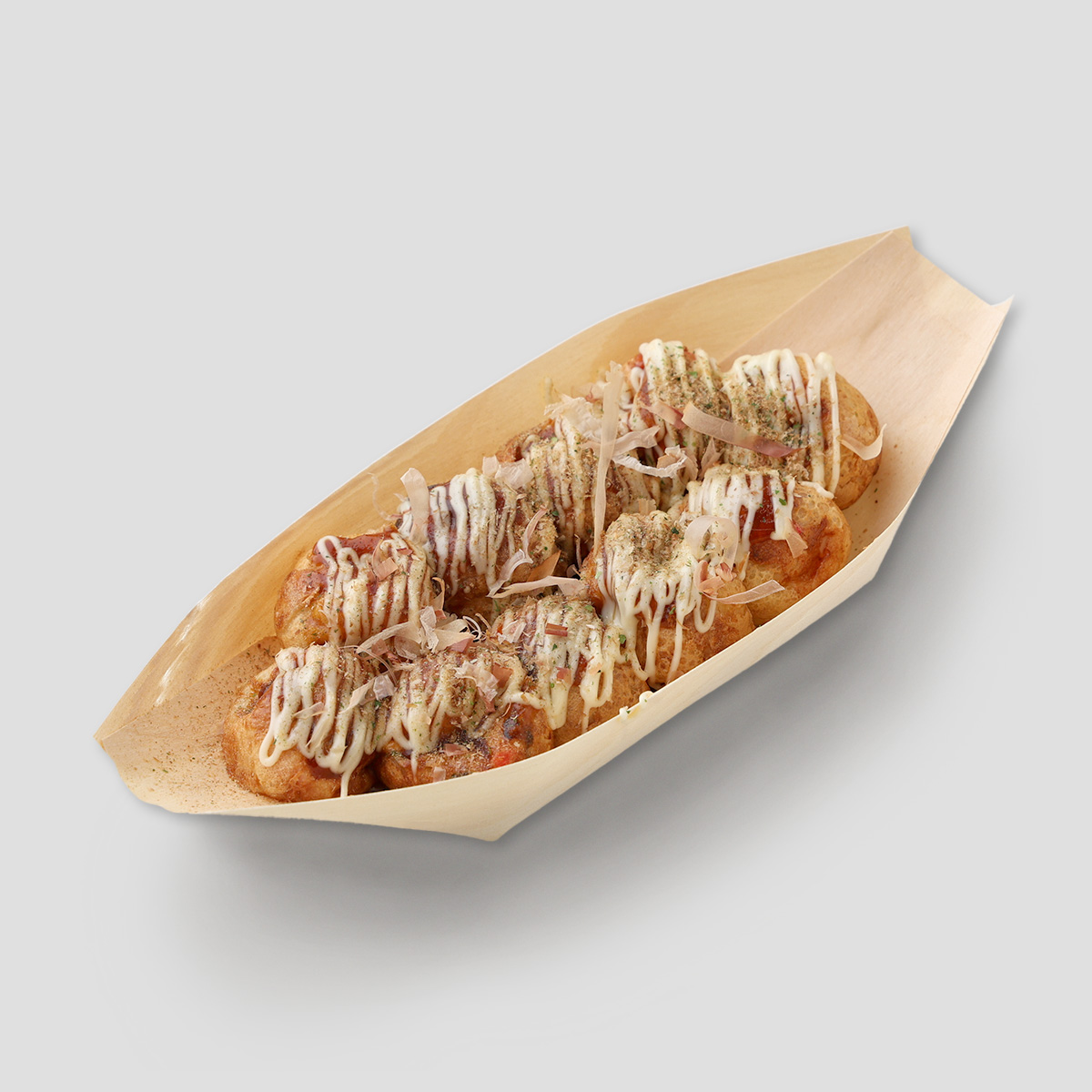 かつお風味の醤油味。出汁の効いた生地と柔らかいタコの味が広がる、小振りで口当たりの良いふわとろ食感。イートインは白樺舟皿、テイクアウトはHATCHオリジナルのクラフトBOXで提供いたします。