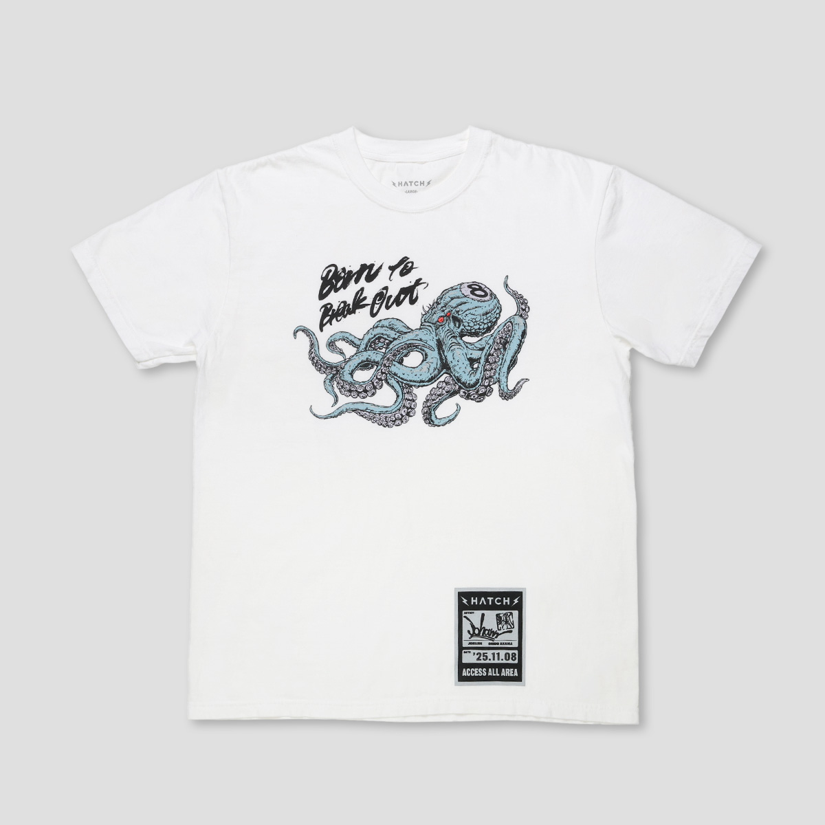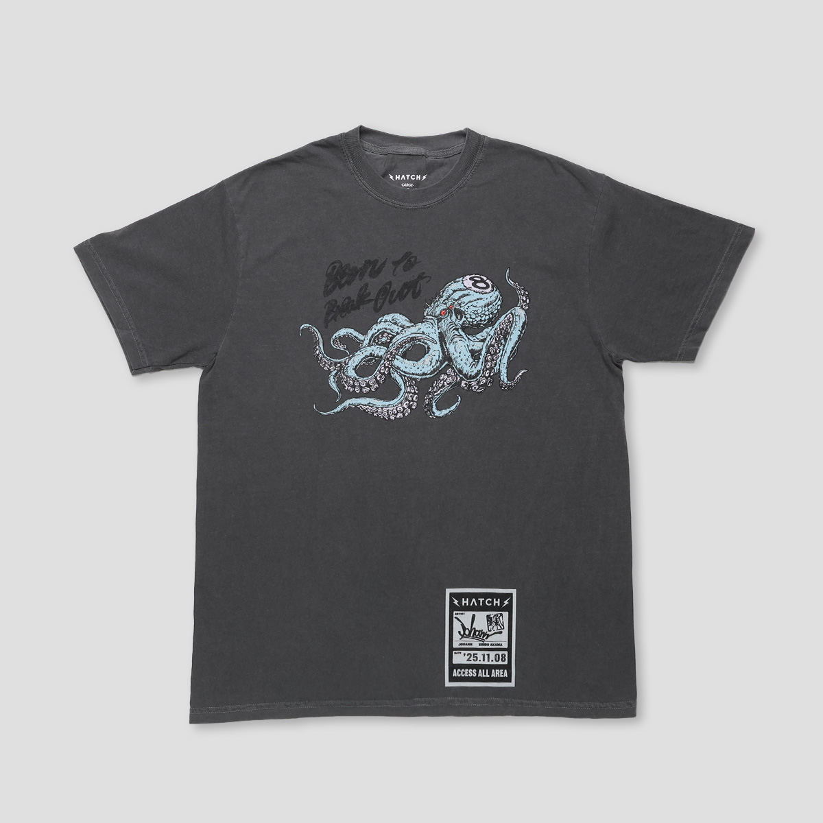 書芸家の赤間紫動とイラストレータのJohannが描き下ろしたコラボアイテム。バンドTシャツをイメージしたプリントデザインは、ライブ会場のゲストパスを模したタグにグランドオープンの日付とサインが記されている。